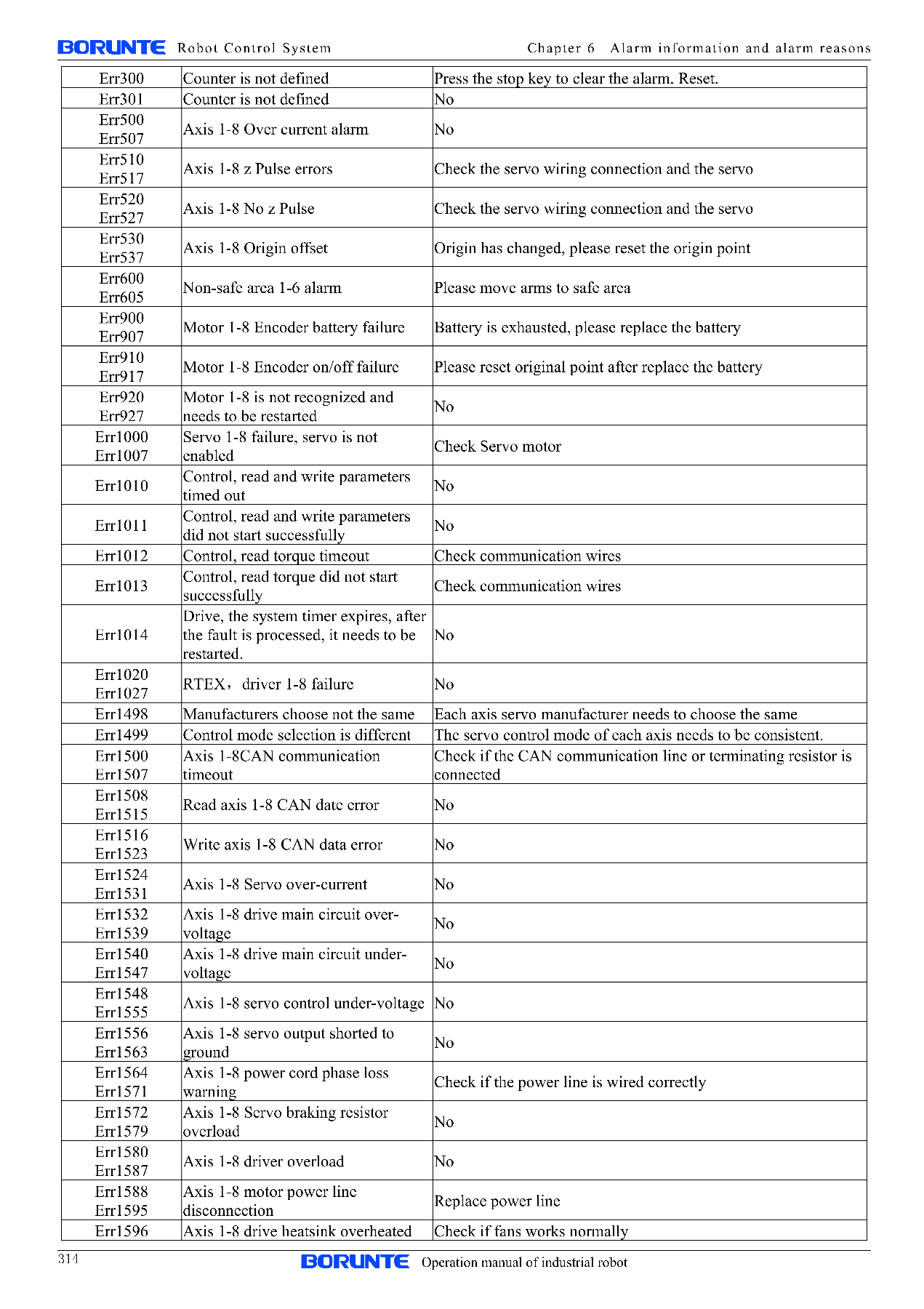 Instruções do robô BORUNTE Capítulo 6 Informações de alarme e motivos de alarme
